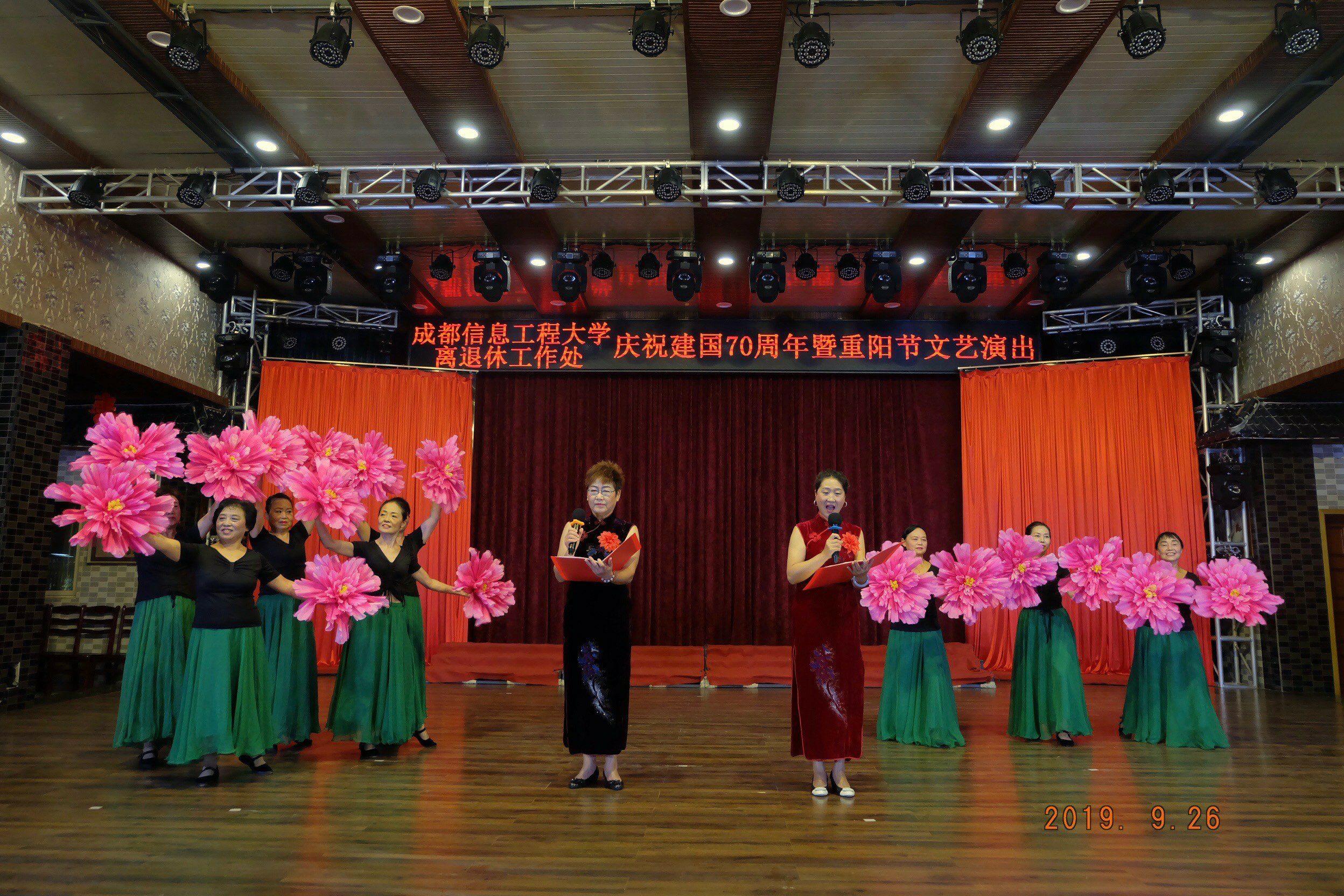 为表达中华儿女对中华人民共和国成立70周年的祝福,学校离退休老师经过几个月的精心排练,上演了一台精彩纷呈的文艺演出:有盛赞祖国的诗歌朗诵《祖国颂》《祖国,一首唱不完的恋歌》,有反映新农村建设的舞蹈《老磨坊》,有歌唱祖国的女声小合唱《我用歌声拥抱祖国》《我的姐妹兄第》,强身健体的中华通络操,还有表现离退休老师把最美的青春岁月献给亲爱的祖国,献给学校的舞蹈《芳华》……老师们的精彩表演,赢得观众阵阵掌声。在全体人员大合唱《我和我的祖国》歌声中,演出圆满结束。