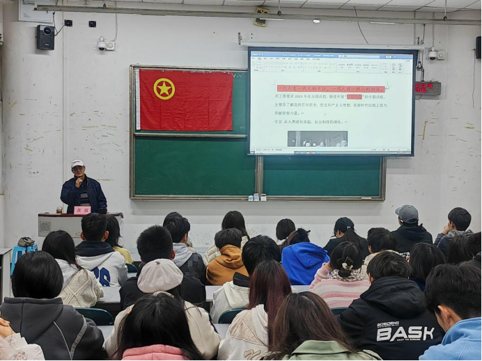 黄波老师首先向同学们讲述了自己作为一名教师、作为关工委成员的责任与担当,分享了自己青年时期求学及在新中国建设中的经历,鼓励同学们要多读书、多读名著,积极参加社会实践,“既多读有字之书,也多读无字之书”。要珍惜大学四年的时光,不仅要学习专业知识,学会独立思考,更要怀揣理想与追求。黄波老师从“五四运动”到新中国成立后支援边疆建设,从“两弹一星”到改革开放,回顾中华民族的历史征程。通过向学生提问的互动方式,引导同学们深刻了解历史,感受革命前辈为新中国建设谱写的一篇篇壮丽诗篇,激发强国有我的青春激情。黄波老师希望作为新时代的青年学子,要大胆施展才华,肩负起时代赋予的使命。